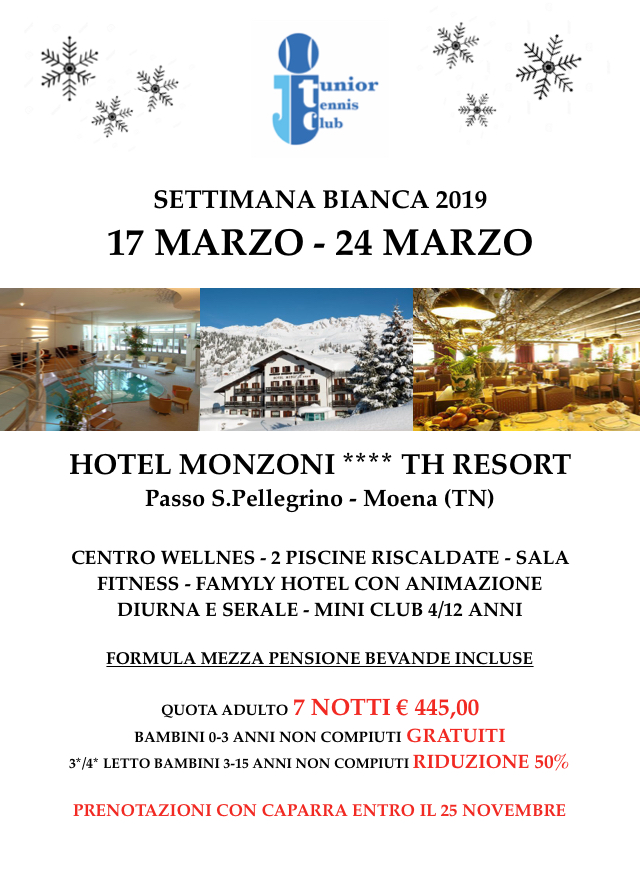 Quest’anno non perdere l’occasione di andare a sciare con lo JUNIOR TENNIS CLUB AREZZO che offre una magnifica promozione per il singolo e soprattutto per la famiglia in una delle più rinomate location dell Dolomiti. INFO SU PREZZI E PRENOTAZIONI PRESSO LA SEGRETERIA DEL CLUB O CHIAMANDO LO 0575/21651